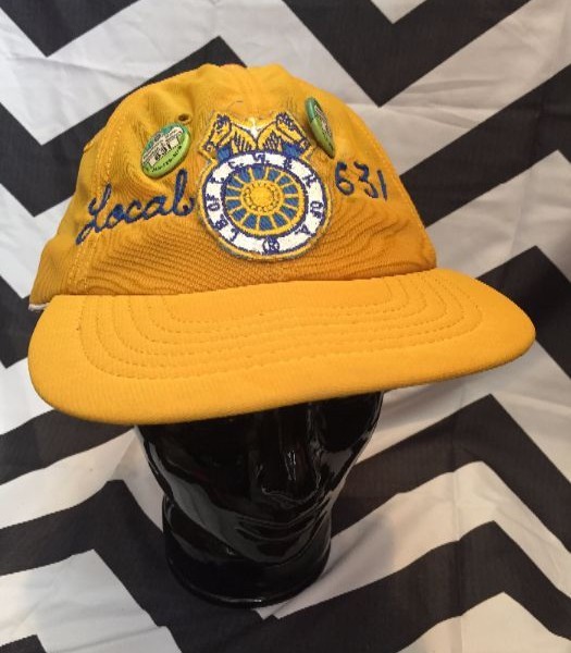 Local 631 baseball hat, with buttons and patch, nylon, yellow hat with white/blue