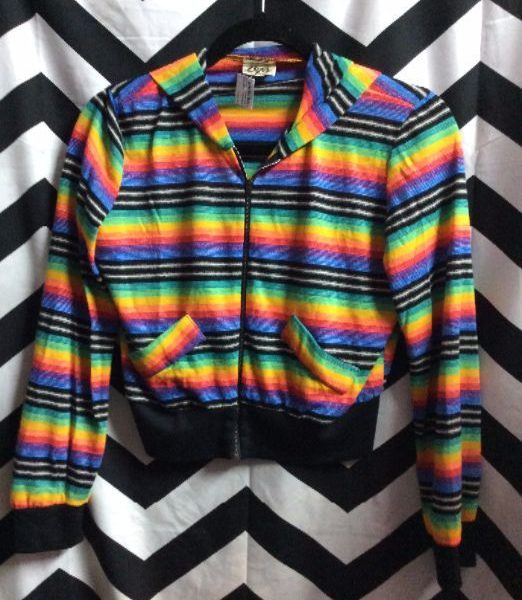 Sweater, zip-up, hoodie, neon rainbow colors, horizontal striped design, black/multi, size S