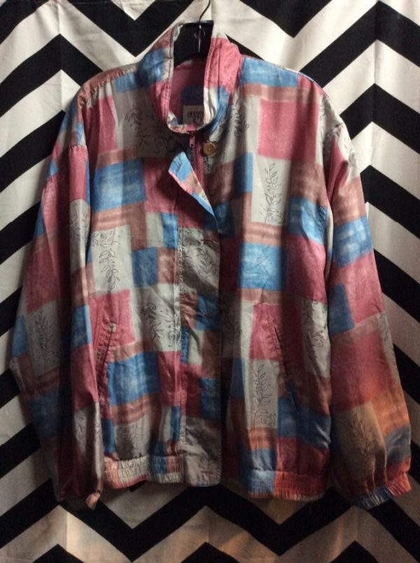 Windbreaker jacket, silk, zip-up, square pattern design, pink/blue/gray, size L