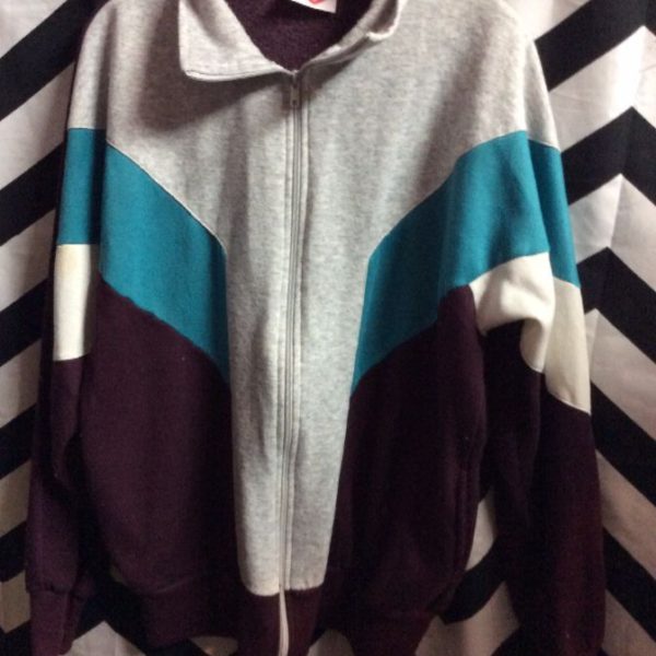 Sweatshirt/jacket, zip-up, tri toned color block design, maroon/turq/gray as is