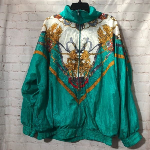 Resort Bay bomber jacket, nylon, zip-up, solid color & Baroque family crest print in a color-block design, teal/white/gold/multi, size XXXL
