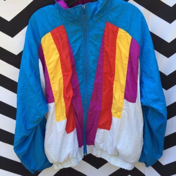 Windbreaker jacket, nylon, zip-up, color block design with bright colors, white/yellow/blue/red/purple, size XL