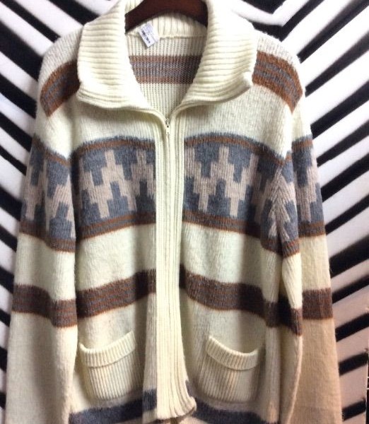 Cardigan sweater, soft wool, zip-up, Aztec design, creme/brown/grey