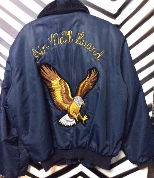 US Air National Guard bomber jacket, zip-up, faux fur collar, embroidered lettering, flying eagle jacket back patch, navy, size L