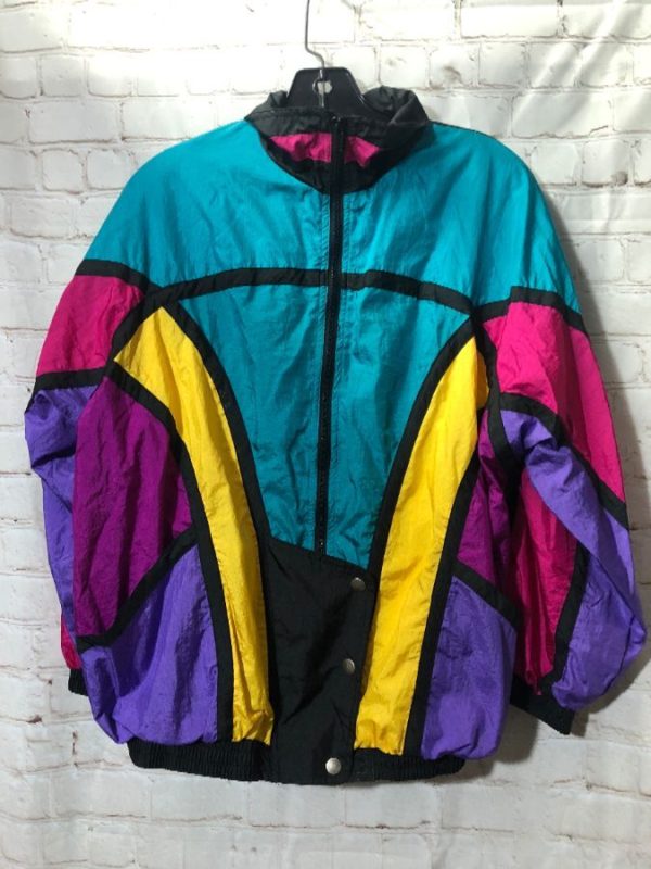 Slade windbreaker jacket, nylon, zip-up, fully lined, stained glass panel look color-block design, black/pink/teal/yellow/purple, size M