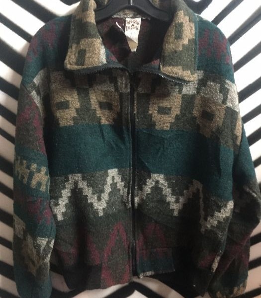 Bomber jacket, zip-up, soft wool, teal/brown Aztec design
