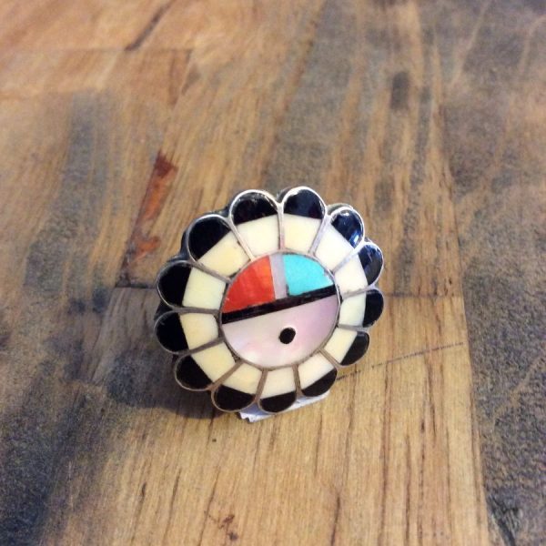 Inlayed Zuni Sunface ring with 925 Sterling sliver setting, MOP/coral/turq/silver, size 6.5